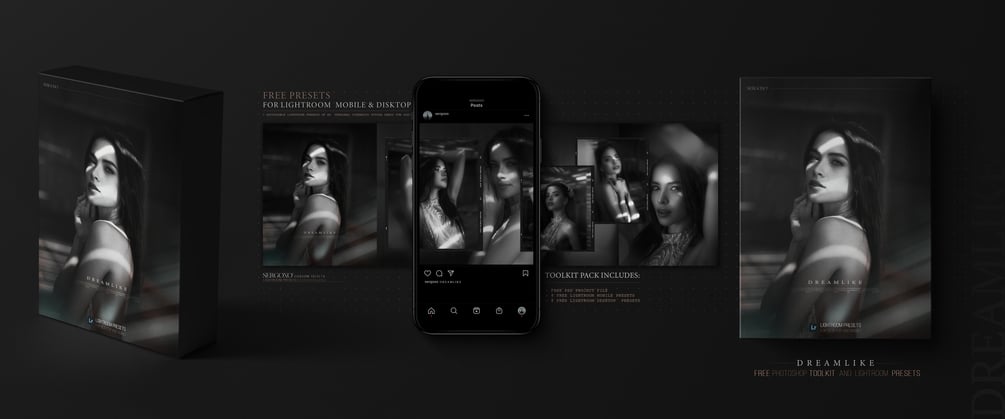 Dreamlike Toolkit Photoshop layout Template & Lightroom presets bundle. dreamlike film look offers an iconic black & white image, This film look is just enough to enjoy the nostalgic feel of classic black & white film, with more glow added for a unique alternative to its counterpart offering more direct emulation.